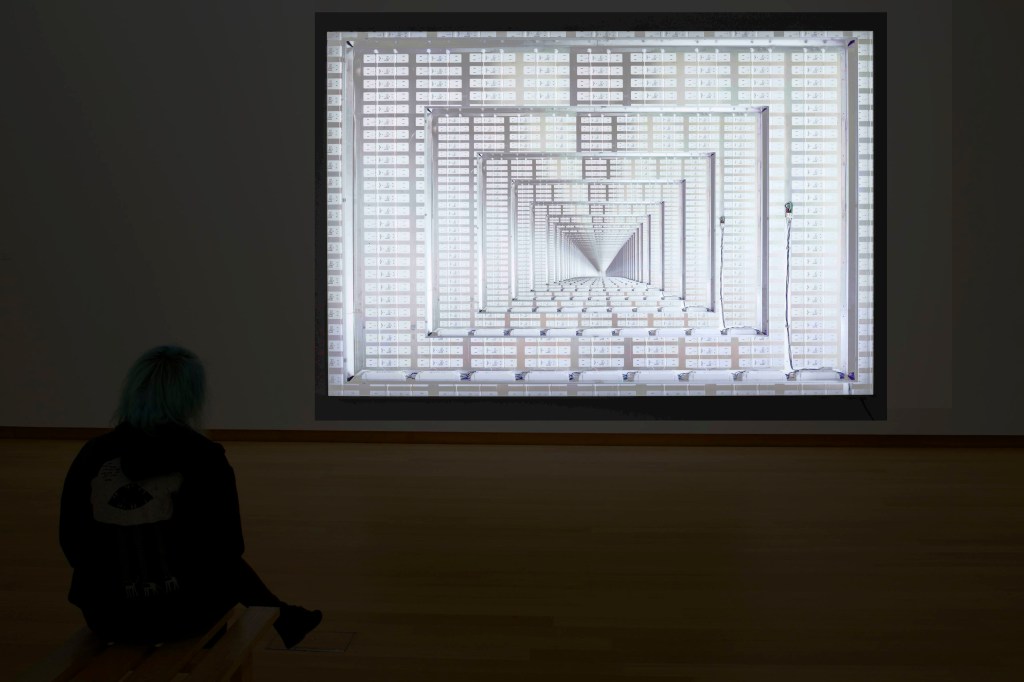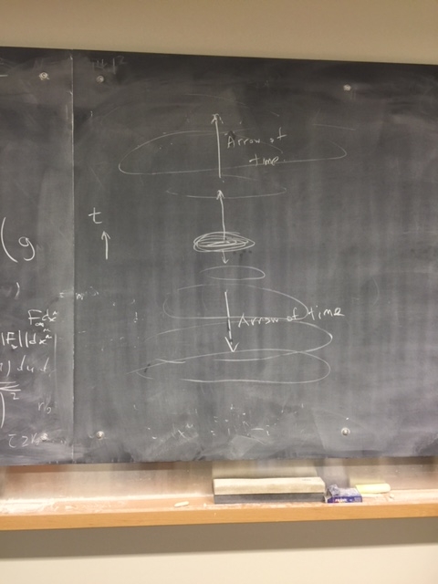 The arrangement of the digitally constructed image, illuminated by the large number of the LEDs underlying the print, relates to a “two-headed arrow of time” spacetime model of the physicists Alan Guth and Sean Carroll. The model has two futures, each of which is the past of the other, resulting in a spacetime that is symmetric in time.