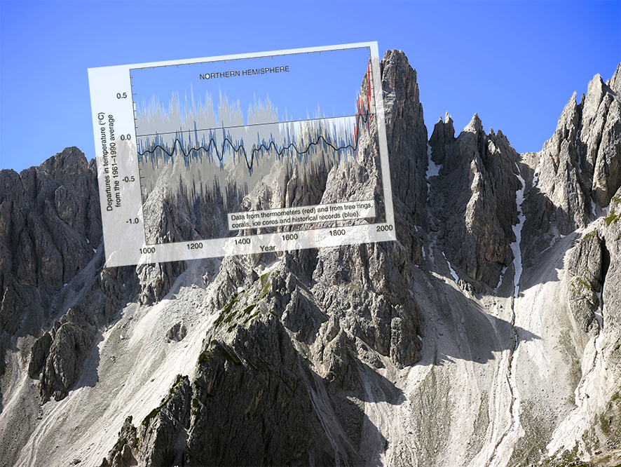 A mountain range, which strongly resembles the so called hockey stick curve – the often quoted and discussed curve about global warming made by climate researcher Michael Mann – is marked by adding the year dates and coordinates of the curve, which are engraved into the rocks.